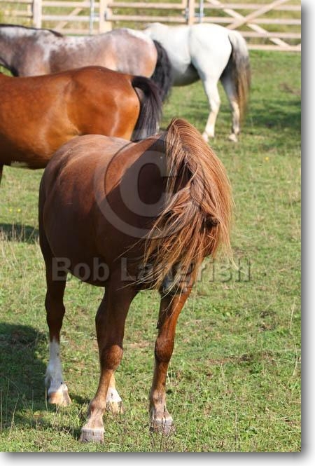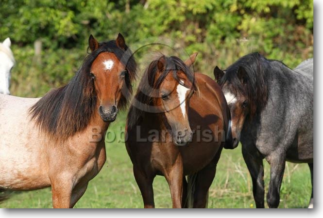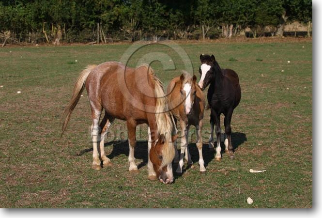 Rear View, Welsh Mountain Mare, Foal & Adopted Foal, The Butts Farm Rare Breeds, UK |