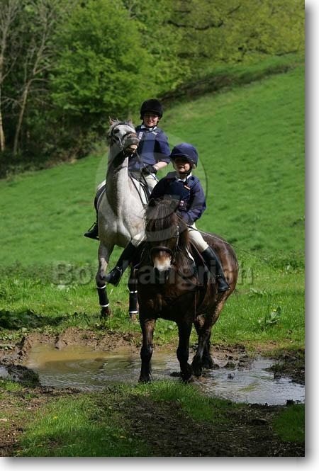 JQ4P0008 Appaloosa & Exmoor Children Riding Through Water-Appaloosa Resisting