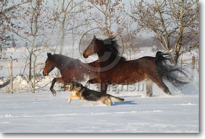 Morgans & German Shepherd Dog In The Snow, Dawnville Farms, AB